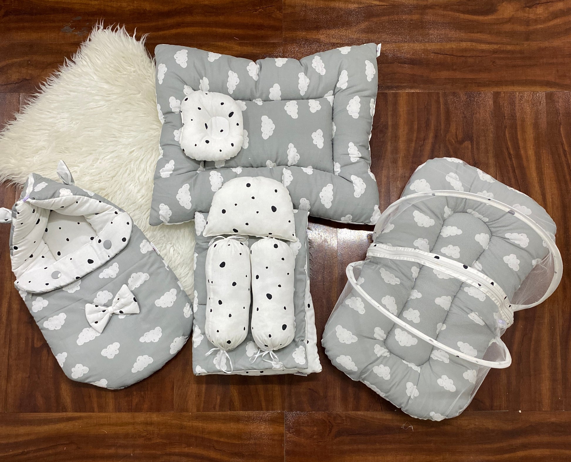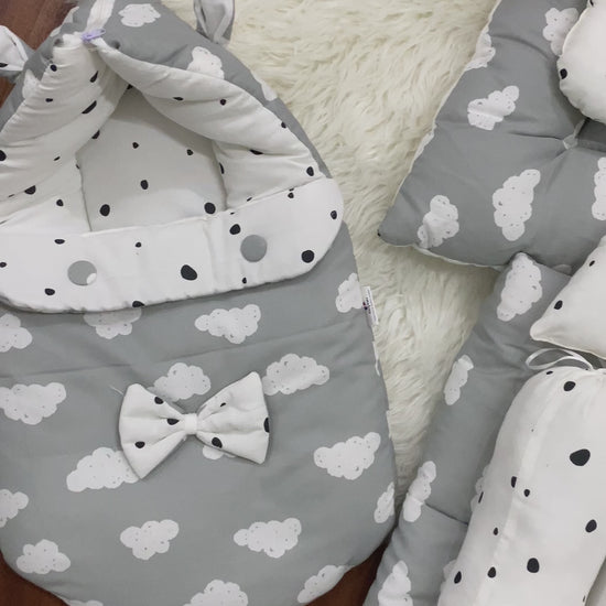 Bedding Solution: 4 plush pillows, a protective mosquito net, a warm comforter, a comfy mattress, and a handy carrynest